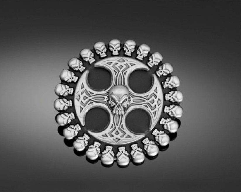 Стильная металлическая пряжка с черепами с вращающимся крестом послужит отличным подарком любителю брутальной символики.