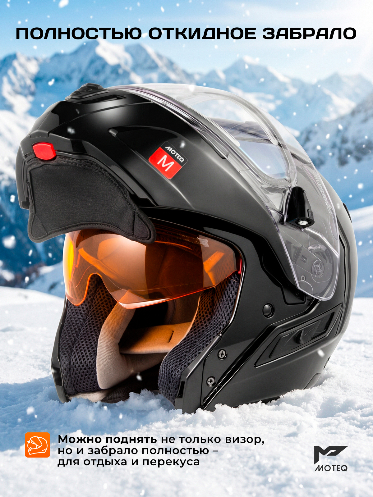 Новый MOTEQ SubZero - это легкий снегоходный шлем модуляр с двойным стеклом с электроподогревом, встроенным солнцезащитным визором и улучшенной видимостью!